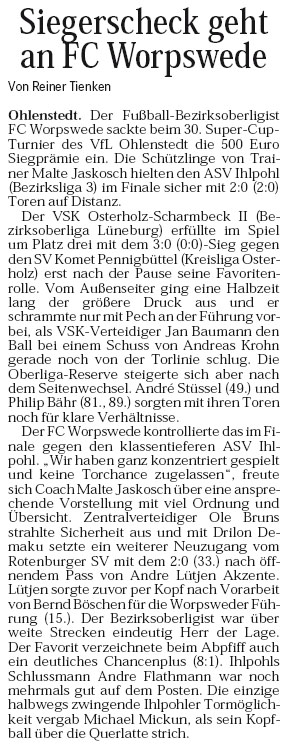 (by Marvin): Auch im Endspiel der Sportwoche in Ohlenstedt zeigten wir eine überzeugende Leistung und setzten uns völlig verdient mit 2:0 (2:0) gegen den ASV Ihlpol durch. Gleich von Beginn an wurde klar, dass wir für die 500 Euro Preisgeld durchaus eine Verwendung hätten. Es dauerte nicht lange, da zappelte der Ball im Netz. Unser Mittelfeldstratege André Lütjen bewies wieder mal seine ausgezeichnetes Kopfballspiel und köpfte aus kurzer Distanz in den Torwinkel.