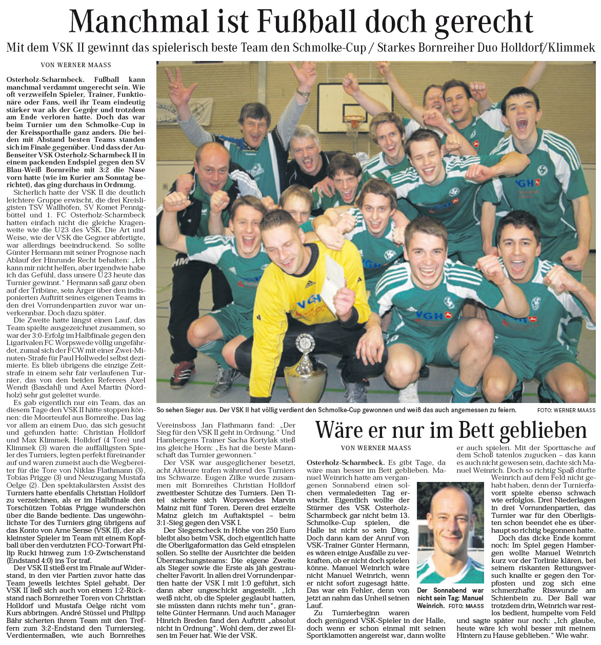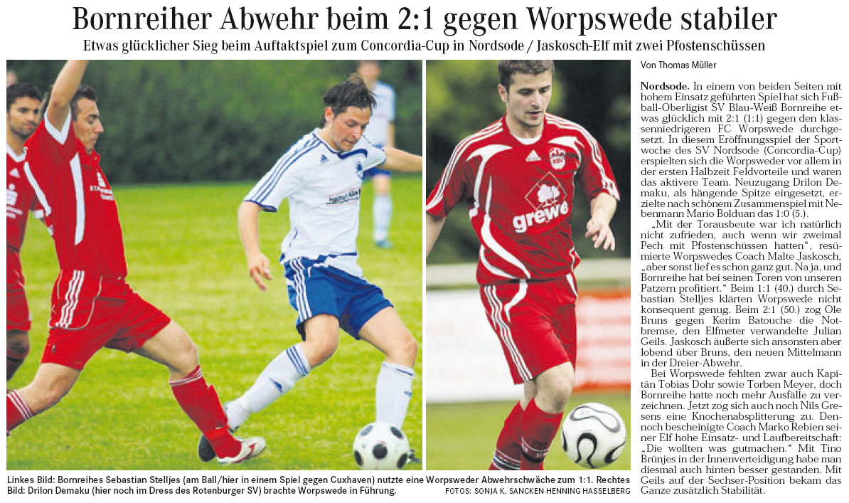 Die Partie wurde von beiden Seiten sehr ernst genommen und war mehr als nur ein Freundschaftsspiel. Die erste Halbzeit wurde von uns dominiert. Mit guten Kombinationen kamen wir häufig vor das Tor von André Cordes. Zur Überraschung vieler Zuschauer gingen wir als Außenseiter mit 1:0 in Führung. Nach schönem Zuspiel tauchte „Drilli“ alleine vor dem Bornreiher Tor auf und schob eiskalt unten links in die lange Ecke. Nach weiteren Chancen durch Drillon und Torsten hätte der Vorsprung weiter ausgebaut werden müssen. Es kam jedoch alles anders. Nach einem Freistoß wurde der Ball nicht richtig geklärt, so dass Bornreihe den Ball aus dem Getümmel heraus in unser Tor einschieben konnte. Im zweiten Durchgang wurden die Blau-Weißen etwas stärker. Wir zeigten nicht mehr das Spiel aus dem ersten Durchgang. Nils parierte einige Male gegen die Bornreiher Stürmer. Beim Elfmeter gegen uns blieb er jedoch chancenlos. Ole kam gegen Kerim Batouche etwas zu spät und verursachte somit einen zweifelhaften Elfmeter der zum 1:2 führte. Kurz vor Schluss bot sich Drillon erneut die Möglichkeit den Ausgleich zu erzielen, doch wieder scheiterte er am Pfosten. Somit kann man sagen es war ein gutes Spiel, auch wenn das Ergebnis anders hätte ausschauen könnte. Presse Bericht / Presse Telegramm |